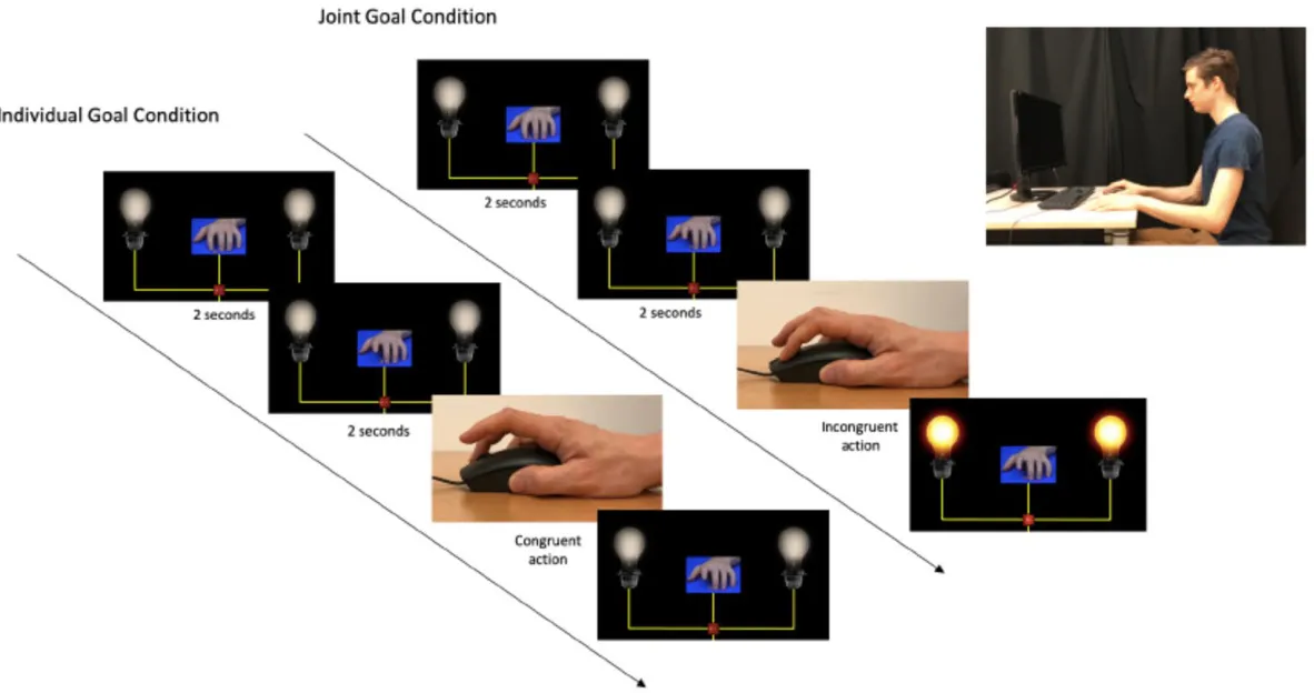 Figure 3. Illustration of the task. Participants were instructed to lift the same finger as the hand in the video when a ‘1’ is displayed (Congruent Condition) and to lift the other finger when a is displayed (Incongruent Condition). The left side illustrates the Individual Goal Condition, in which the lights never turn on. The right side illustrates the Joint Action Goal Condition, in which the lights are turned on when two conditions are fulfilled: the number cue indicates that the participant should perform the ‘incongruent’ action, and the participant correctly does so.